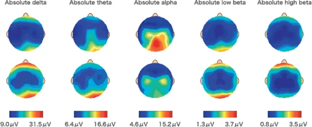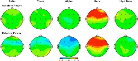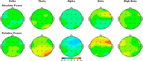 上記はこの患者様の治療後のQEEG検査結果です。真っ赤になっていた前頭葉のβ波が正常範囲に戻っているのがわかります。